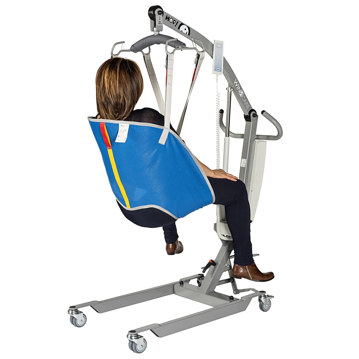 Grua ergonómica para transferência, com capacidade para levantar uma pessoa do chão (alcance até 1,57 m).